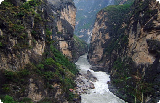在云南省麗江納西族自治縣石鼓東北。長江上游金沙江到此急轉(zhuǎn)北流。峽谷長16公里,右岸玉龍雪山主峰海拔5,596米,左岸中甸雪山海拔5,396米,中間江流寬僅30~60公尺?;⑻鴯{的上峽口海拔1,800公尺,下峽口海拔1,630公尺,兩岸山嶺和江面相差2,500~3,000公尺,谷坡陡峭,蔚為壯觀。江流在峽內(nèi)連續(xù)下跌7個陡坎,落差170公尺,水勢洶涌,聲聞數(shù)里。當年堯茂書的探險隊就曾經(jīng)在此漂流,雖英雄壯志未酬身先去,此地卻因此而名聲大振。